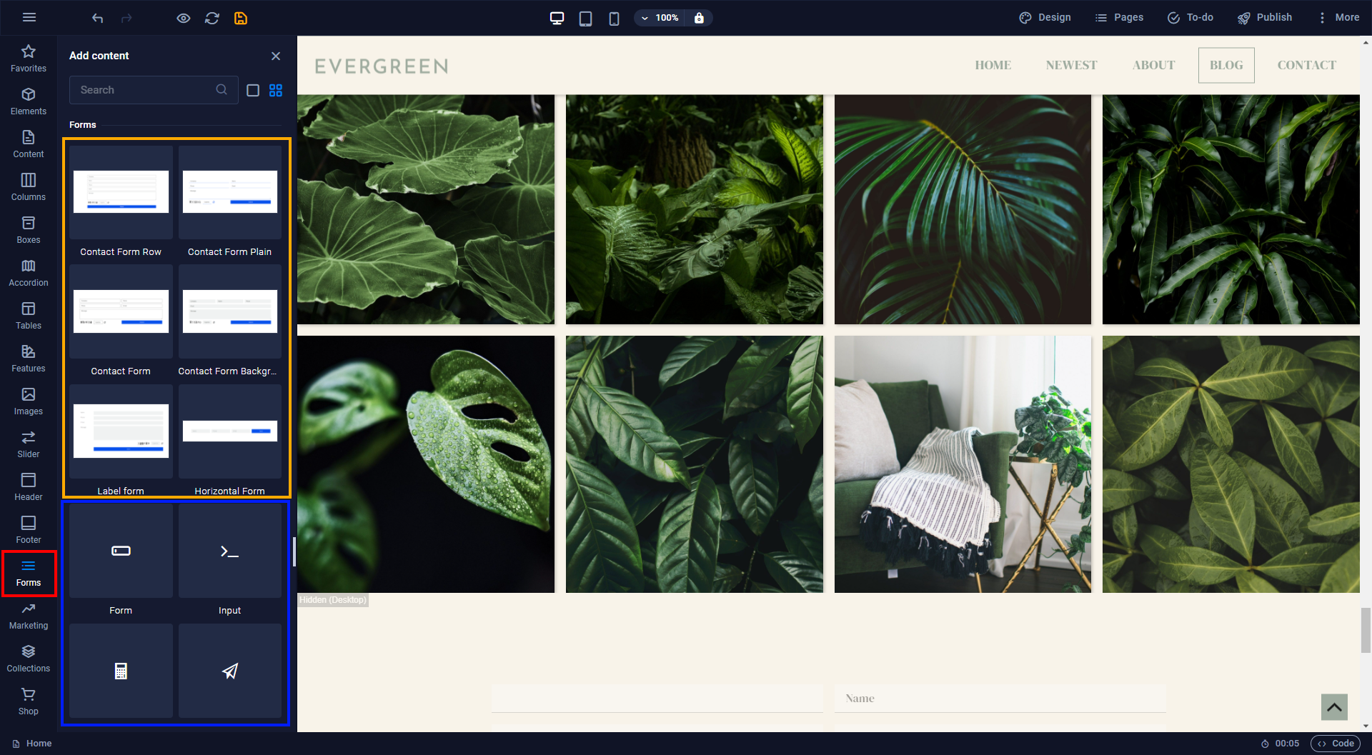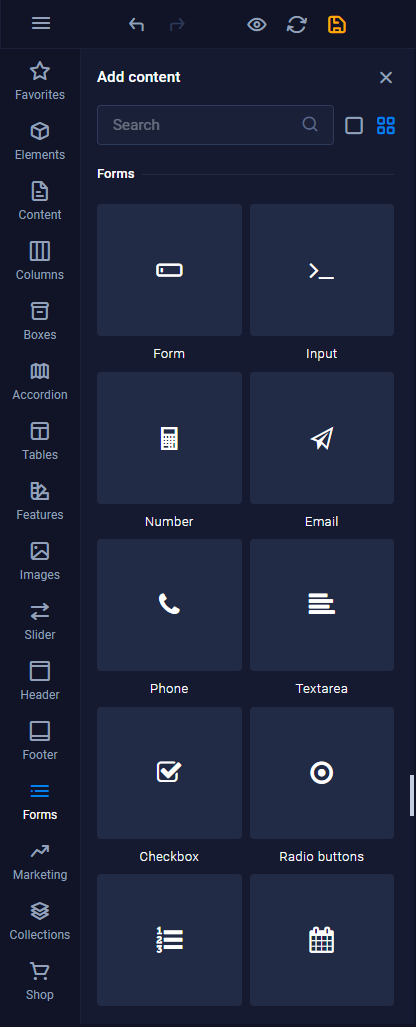 To add a form to your website click on the category "Forms" on the left sidebar. This will open the content panel that shows you all form presets (marked in orange) which are fully functional contact forms that consist of different form elements. Below the presets you can see all individual form elements (in blue). You can add more form elements to form presets to customize them to your needs.