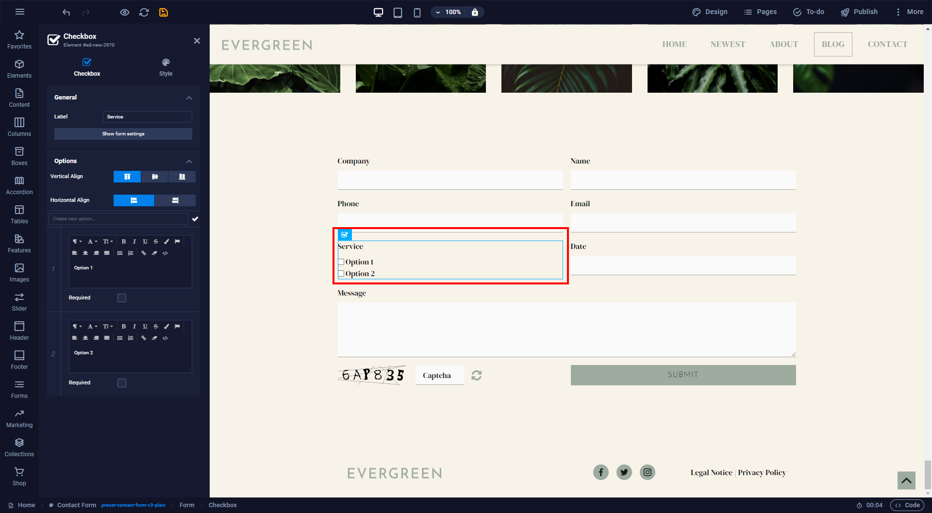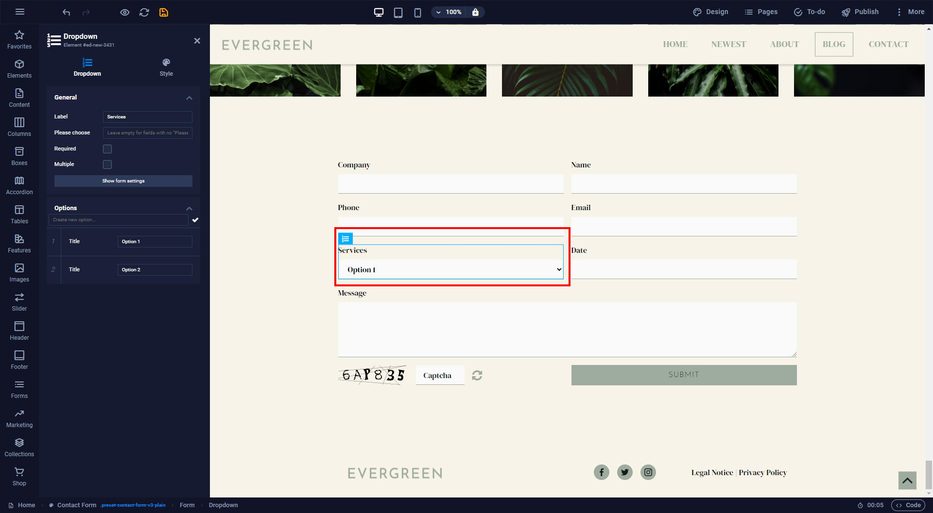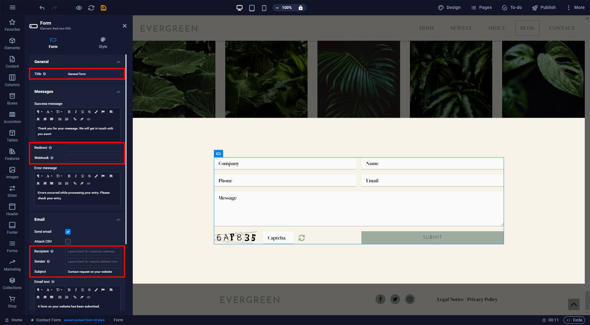 Once you have dragged the preset onto the website, a fully functional contact form will be available. As you can see in the breadcrumb a form preset consists of three different levels: