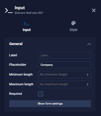 Text elements are useful when plain text input is required. This can be used for names, titles, address lines, etc. You can assign labels that are displayed above or next to the input field. Placeholders are also possible.