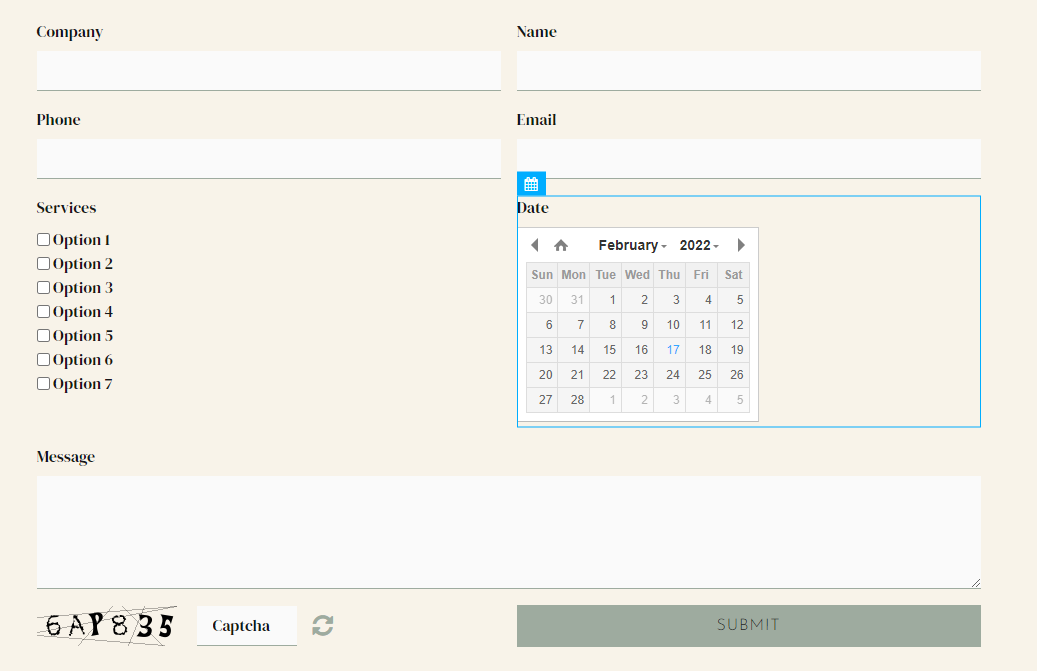 Date and time fields are useful for setting a possible date and usually have to be created with Javascript. In Sitejet, it is sufficient to add this element and customize it according to your wishes. Sitejet offers you many settings for this.