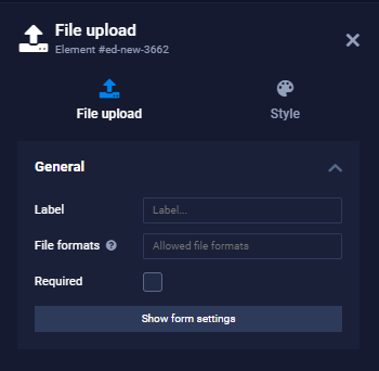 Use this element if you want website visitors to be able to upload files themselves. In the "File formats" field, enter all file formats or types that are allowed to be uploaded. For example, you can enter ".jpg, .png" to allow JPG and PNG files. You can also specify "images/*" as the file type to allow all image file types at once.