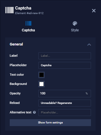 Without these alternatives, it is not possible to save the project without a captcha element. Labels and/or placeholders can also be assigned to the captcha. Additionally, you have the possibility to set text and background colors for the captcha image. A transparent background can be useful if an image background or background texture is used in the form container. Keep in mind that the readability of the captcha is preserved.