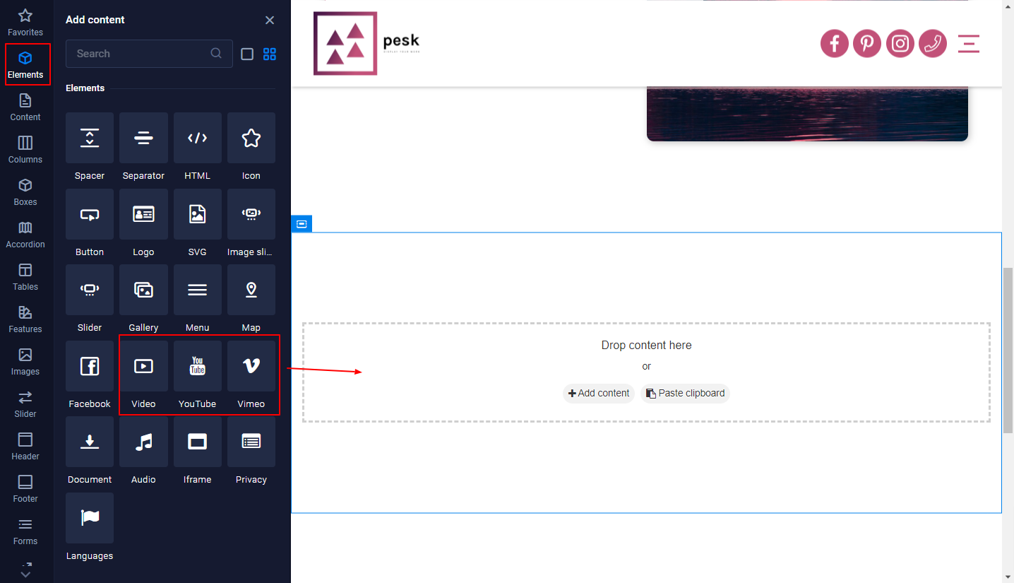 You are also able to add a container and add an Element via "Add Content". Now, choose the Video-Element and drag it into the area.