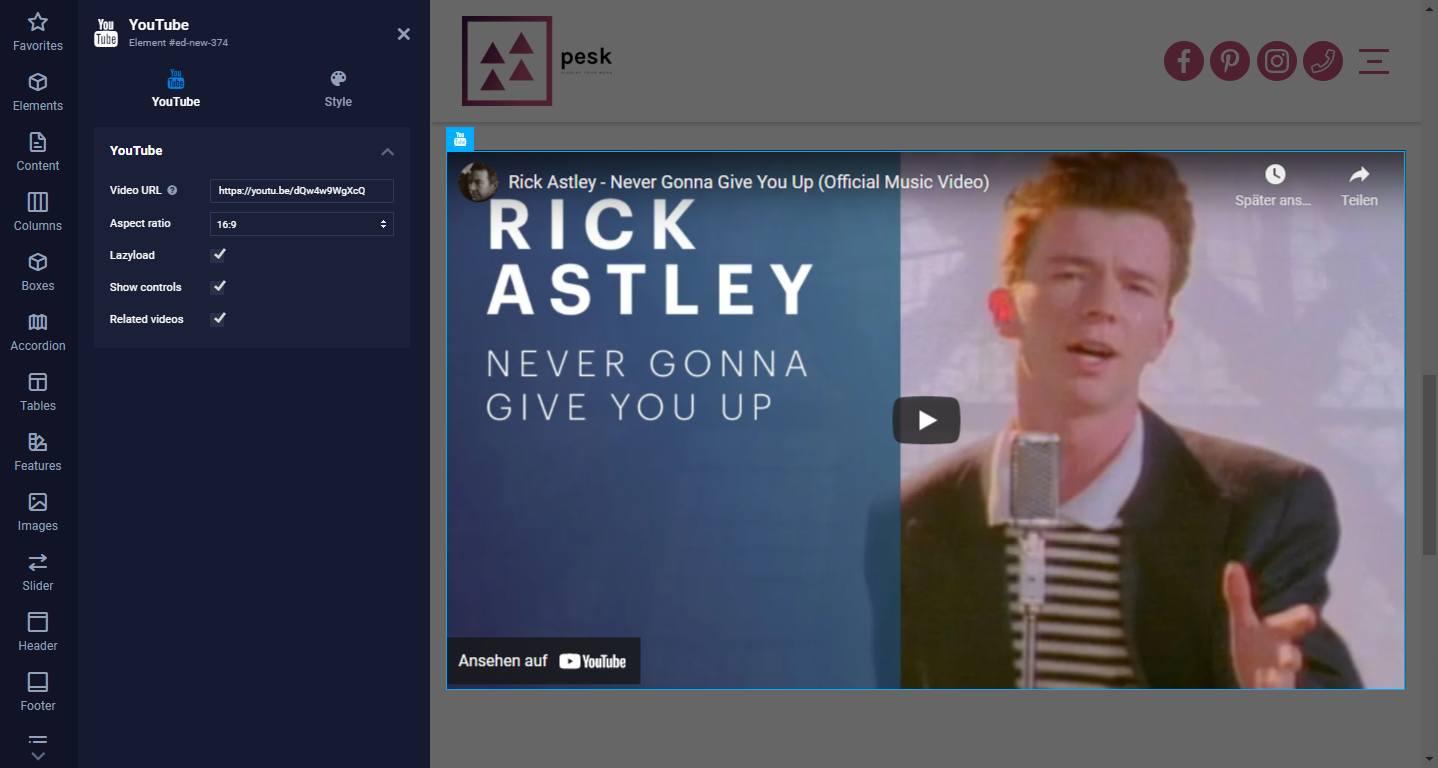 The process of adding a YouTube-Video is the same as a Vimeo-Video. Let's focus on YouTube here, you will see why. The easiest way to embed a YouTube video is by copying the URL of the video and pasting it into our YouTube element.