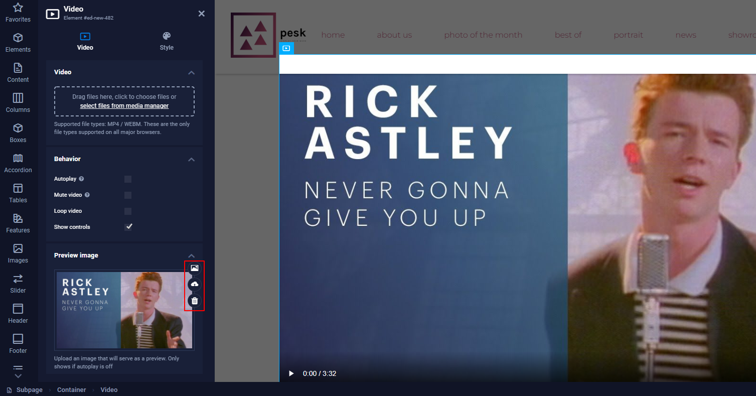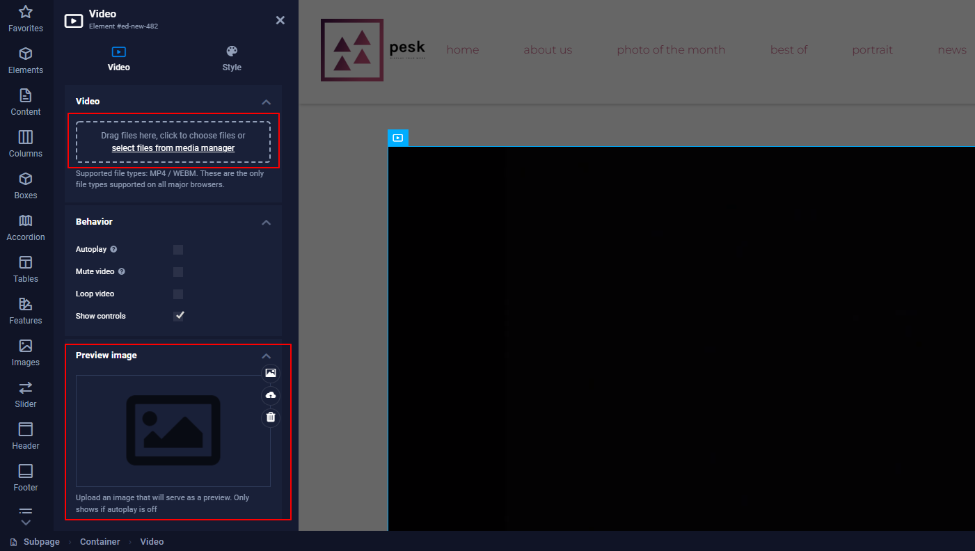 It is now possible to add a video directly from the Media Manager and also add a preview image. In between, you find settings to adjust the behavior of the video.