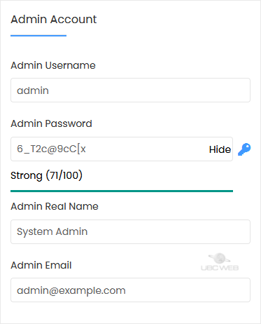 - Admin Username: Your new Contao username (for security reasons, do not use the administrator or the admin username).