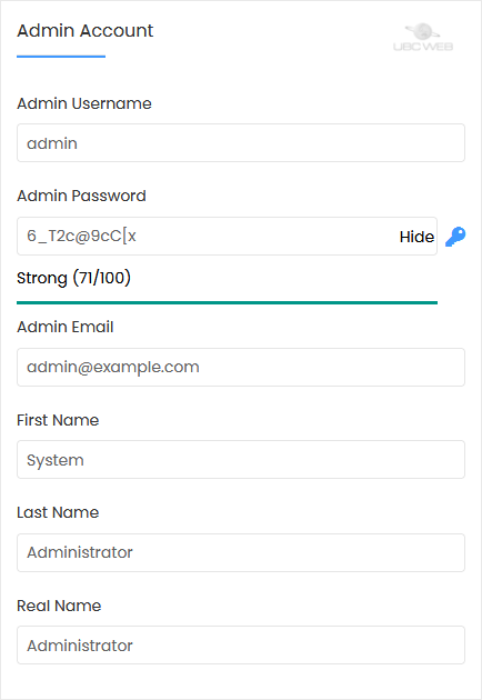 7. Under the Admin Account field, enter the following information: